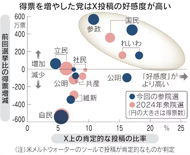 - 社民党は選挙期間中のX投稿数・拡散数でトップだったが、比例代表の得票数は最少。